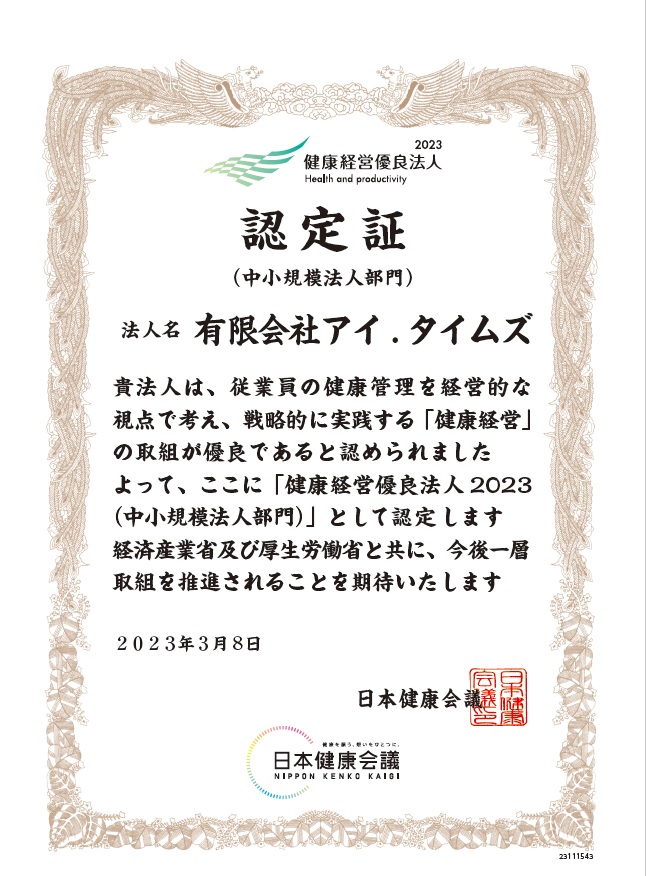 実施する「健康経営優良法人2023(中小規模法人部門)」に2021年、2022年に続き認定されましたのでお知らせ致します。