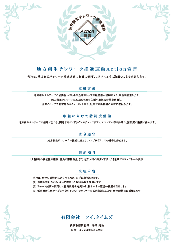 令和4年5月30日、内閣府・内閣官房が推進する「地方創生テレワーク推進運動」の趣旨に賛同し、推進運動に参加する為「Action宣言」を行いました。 当該宣言が本日内閣府・内閣官房に正式に受理され、「地方創生テレワーク」事業のホームページに掲載されましたのでお知らせします。